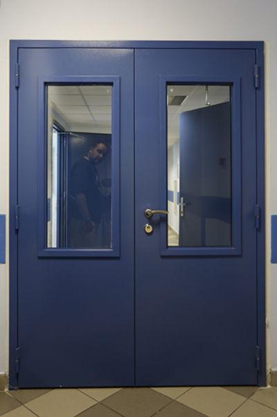 Противопожарная алюминиевая дверь синего цвета в Лобне