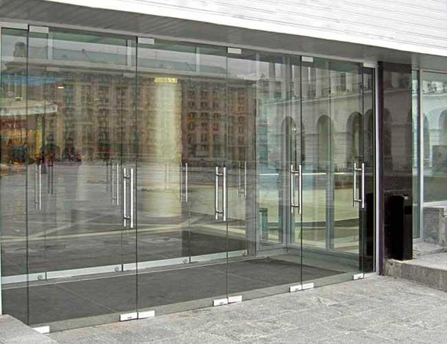 Противопожарная безрамная дверь со стеклом в торговый центр в Лобне