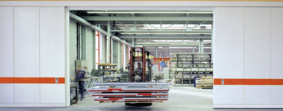 Противопожарные откатные ворота бело-оранжевые на складе в Лобне